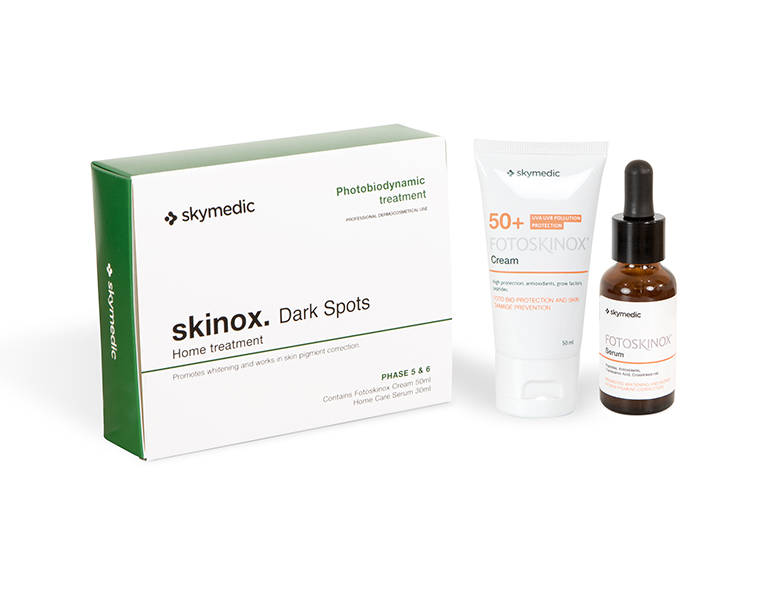 Skinox Dark Spots Home Therapy consists of Fotoskinox SPF 50+ and Fotoskinox serum: